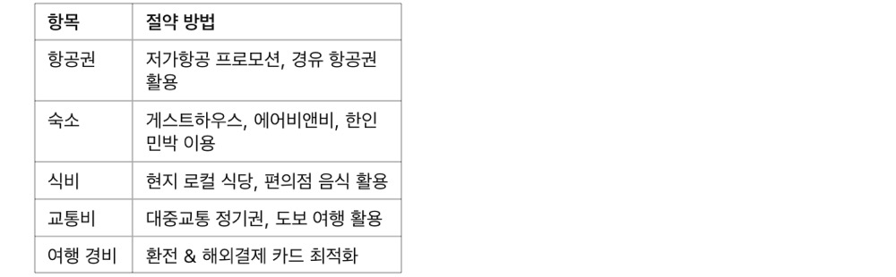 ○ 외식을 줄이고 로컬 음식이나 편의점을 활용하면 식비를 절약할 수 있습니다.