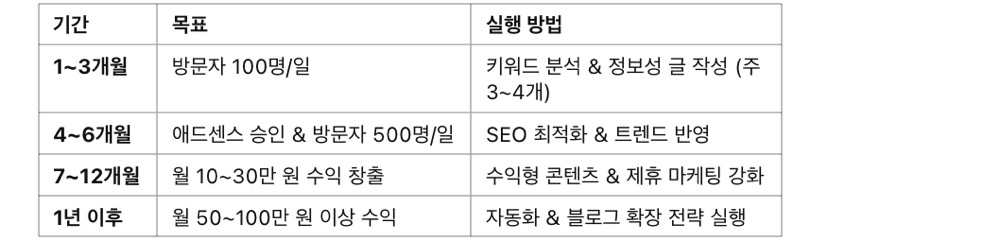 ⇒ 검색량이 높은 키워드는 나중에 도전해도 늦지 않습니다.▶ 4. 블로그 운영 & 수익화 로드맵